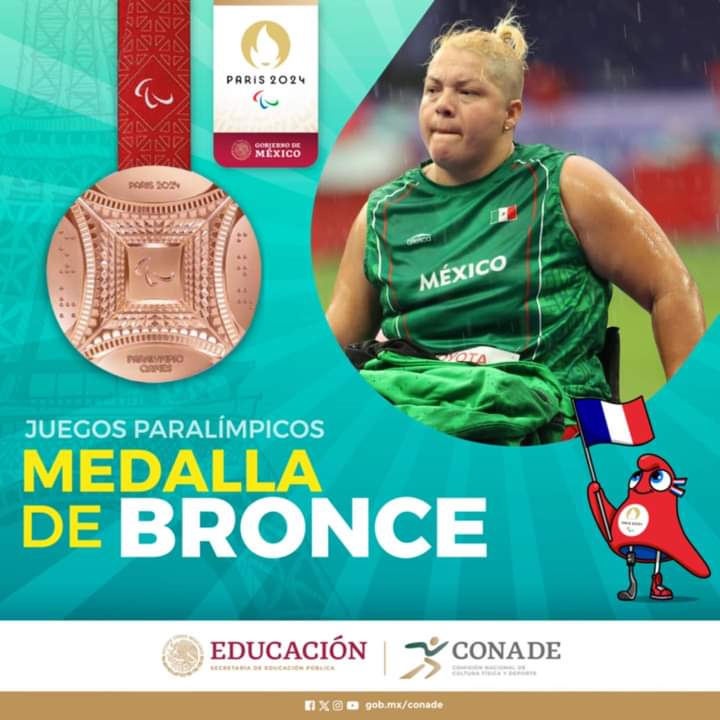 Rosa María Guerrero, logra el tercer lugar con una marca de 25.81 metros en la final de lanzamiento de disco F55 en el inicio del #ParaAtletismo 🏟️ y le da…