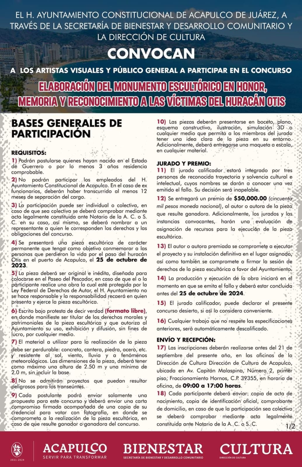 Abren convocatoria para el concurso: Elaboración del Monumento Escultórico en Honor, Memoria y Reconocimiento a las víctimas del Huracán Otis.