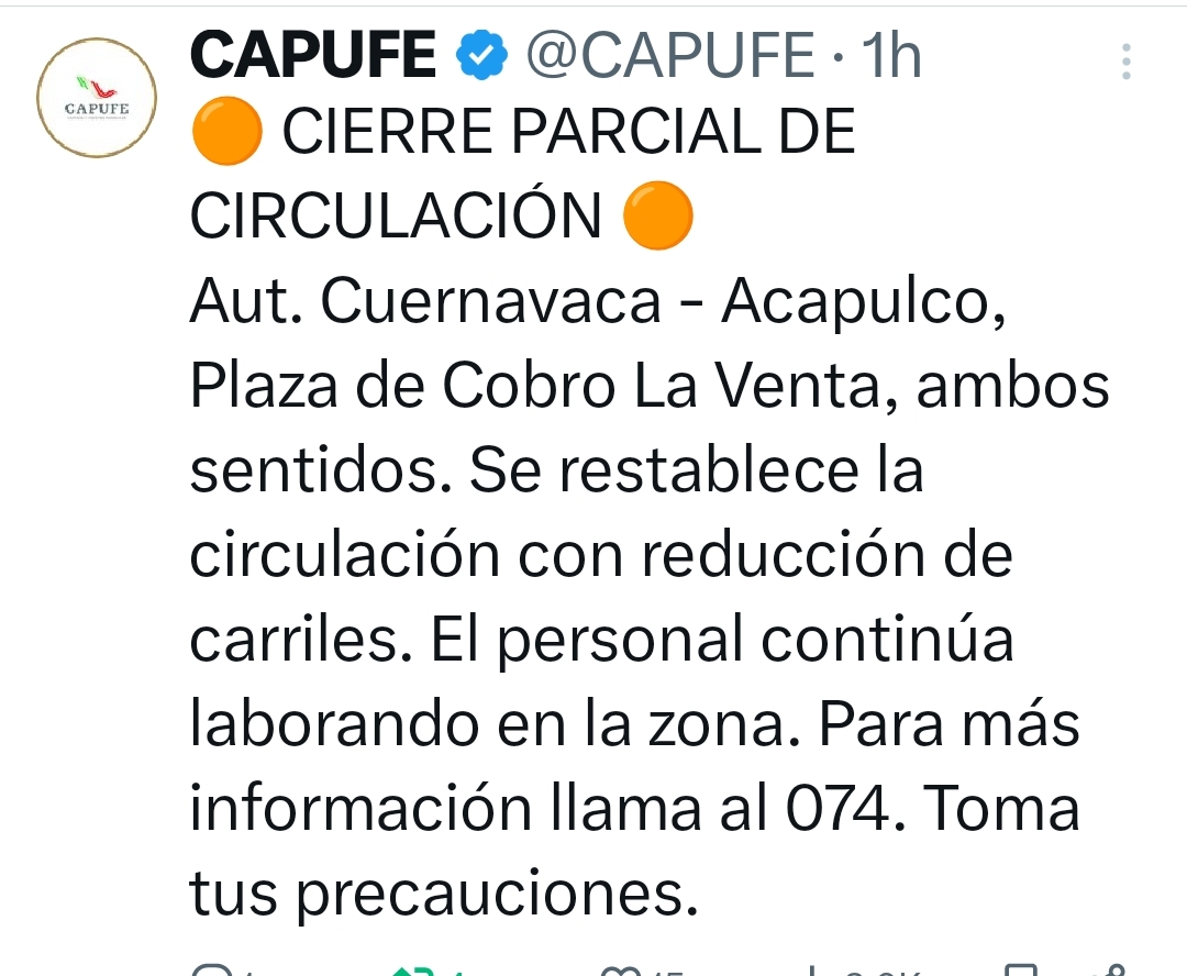 Actualización de #aviso a las personas usuarias de la autopista #ChilpancingoAcapulco. Ya se encuentra abierta la circulación en ambos sentidos.