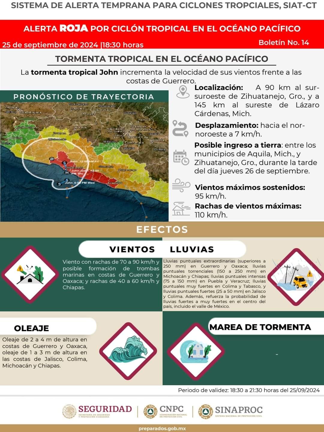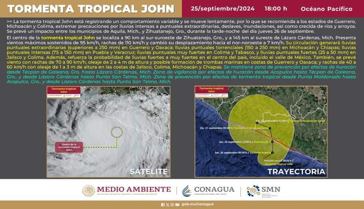 ⚠️ ACTUALIZACIÓN ⚠️ La tormenta tropical #John se mueve lentamente, por lo que se recomienda seguir extremando precauciones. De acuerdo a Conagua Comisión Nacional del Agua-SMNmx se prevé un impacto…