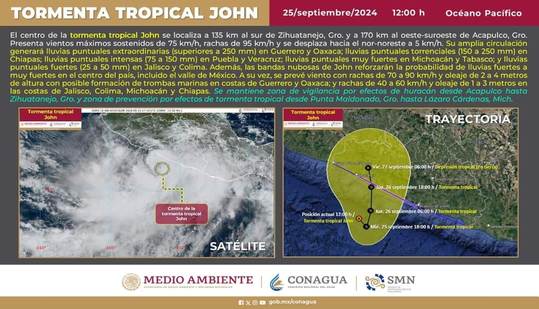 ⚠️ ACTUALIZACIÓN ⚠️ La Conagua Comisión Nacional del Agua-SMNmx informa que la #TormentaTropical #John está a 135 km al sur de Zihuatanejo y a 170 km de Acapulco. Les pido…