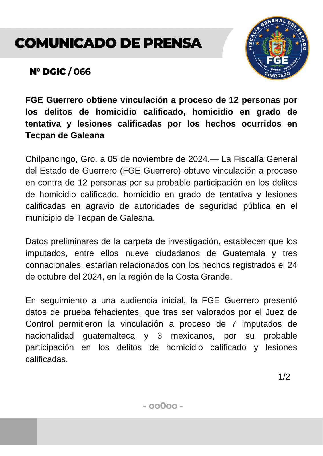 Chilpancingo, Gro. a 05 de noviembre de 2024.— La Fiscalía General del Estado de Guerrero (FGE Guerrero) obtuvo vinculación a proceso en contra de 12 personas por su probable participación…
