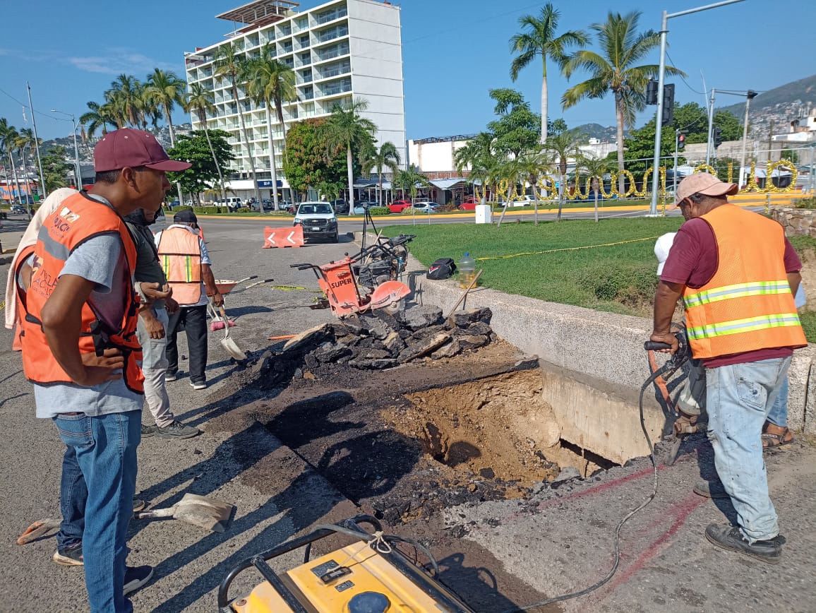 El Gobierno Municipal de Acapulco a través de la Dirección de Maquinaria Pesada y Parque Vehicular, realiza trabajos de reparación en un socavón en Costera Miguel Alemán a la altura…