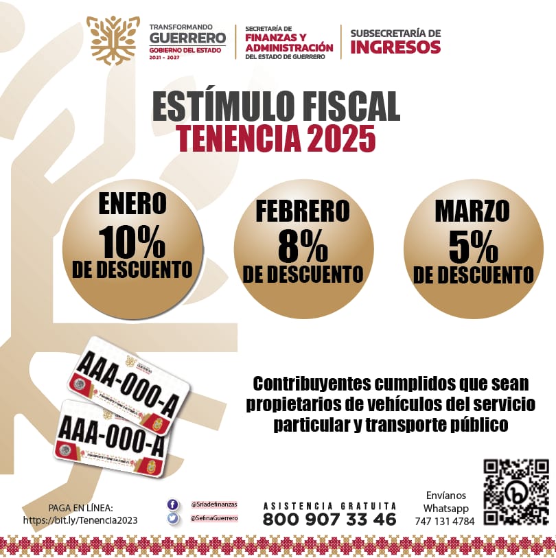El Gobierno del Estado ofrece descuentos del 10 y 8 por ciento en pago de tenencia, de enero a marzo del 2025 Chilpancingo, Gro., 13 de enero de 2025.- El…