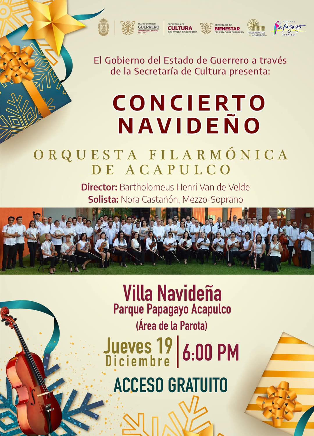 🎄🎋🪅El Gobierno de Guerrero a través de la Secretaría de Cultura y la Secretaría de Bienestar, presentan: 🪅🪄🎻“Concierto Navideño” a cargo de la Orquesta Filarmónica de Acapulco (OFA) dirigida por…