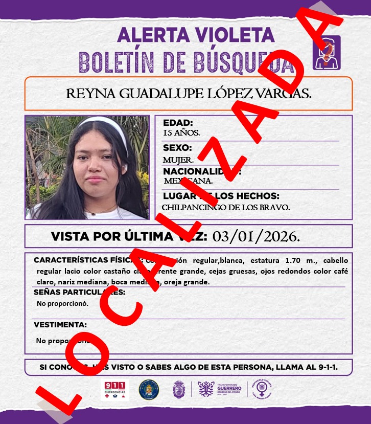 Chilpancingo, Gro., 4 de enero de 2026. La Secretaría de Seguridad Pública del Estado de Guerrero informa que, derivado de la activación de una Alerta Violeta por la no localización…