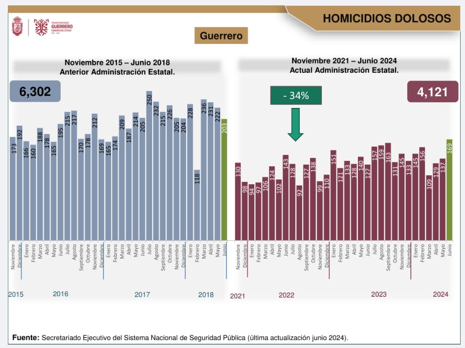 *El delito de homicidio doloso disminuy贸 en un 34 por ciento en comparaci贸n con la administraci贸n estatal pasada Chilpancingo Gro. 25 de julio del 2024. – Resultado del trabajo coordinado…