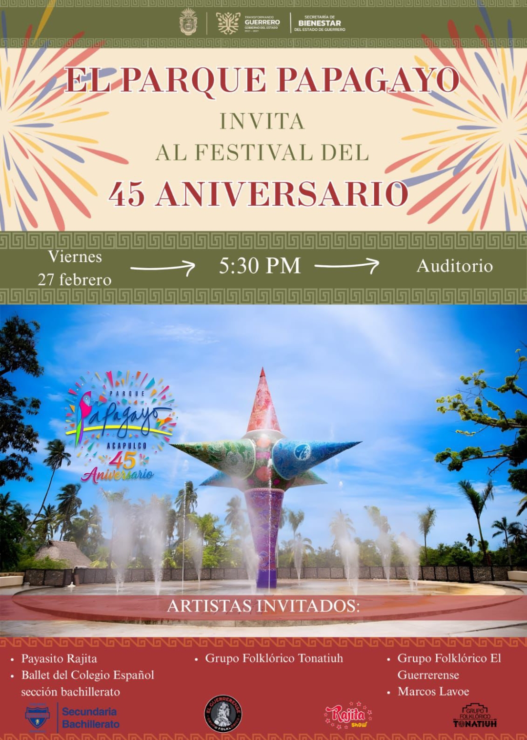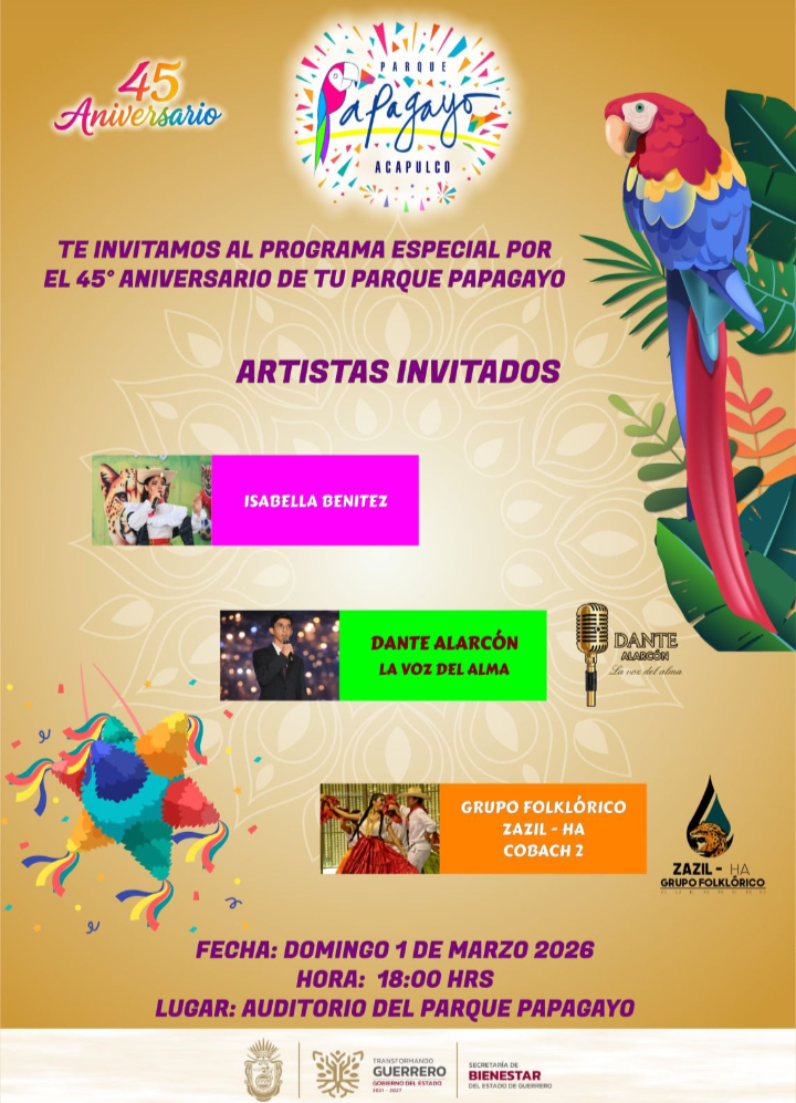 Ven y celebra con nosotros el 45 aniversario del Parque Papagayo, tendremos la participación de: 1.- Payasito Rajita2.- Música Folklórica con el Ballet Tonatiuh3.- El Ballet Folklórico El Guerrerense4.- El…
