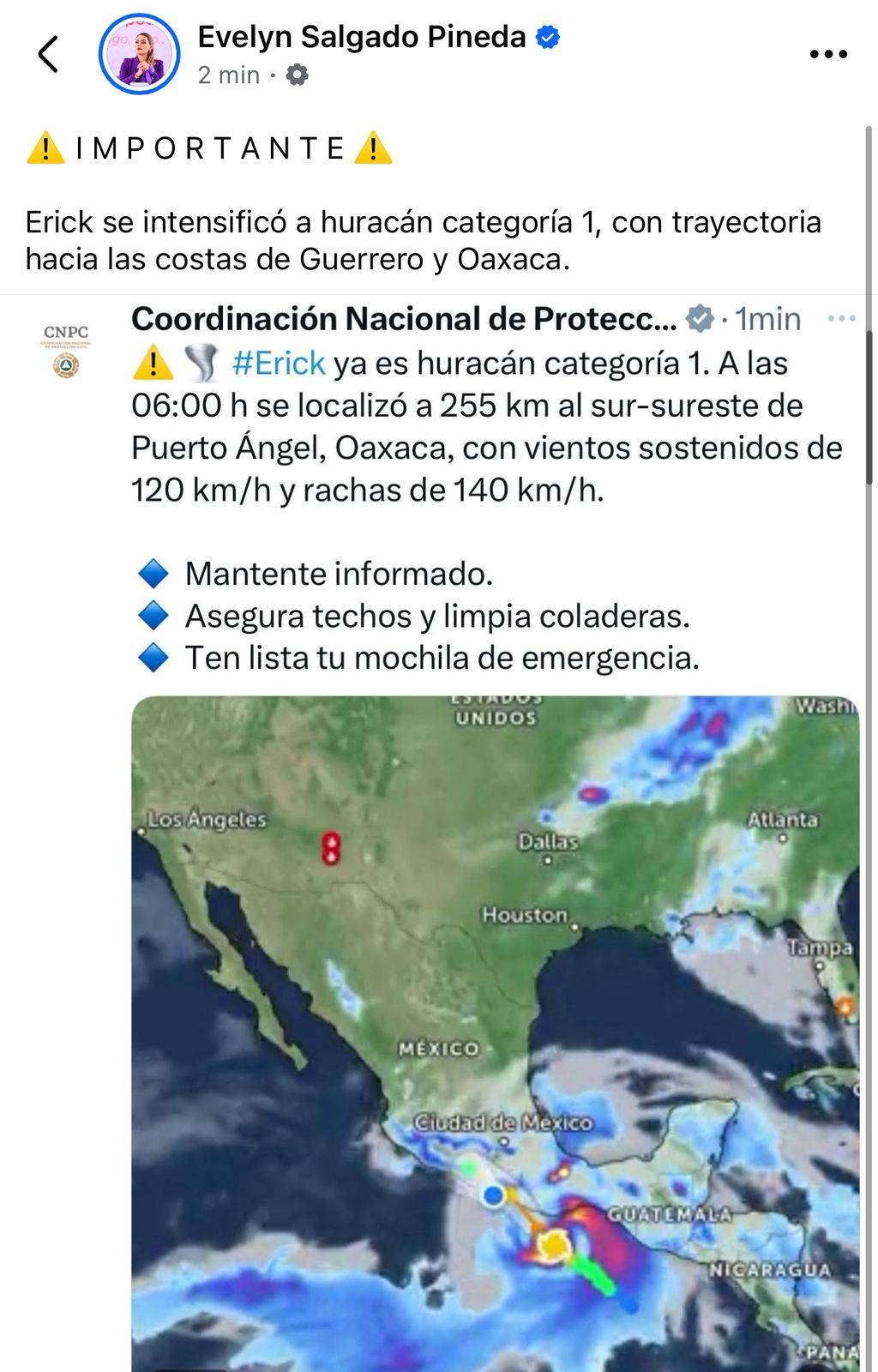 La gobernadora Evelyn Salgado Pineda informó que el huracán Erick ha alcanzado la categoría 4 en la escala Saffir-Simpson, lo que representa un riesgo máximo para diversas regiones del estado…