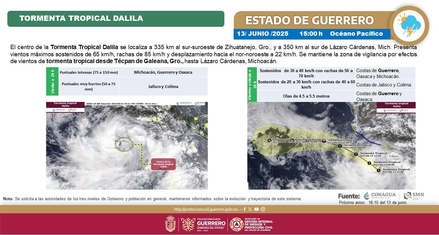 La Tormenta Tropical “Dalila” permanece ubicada frente a costas de Guerrero y Michoacán.