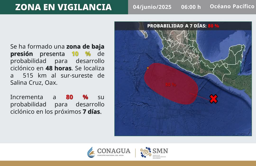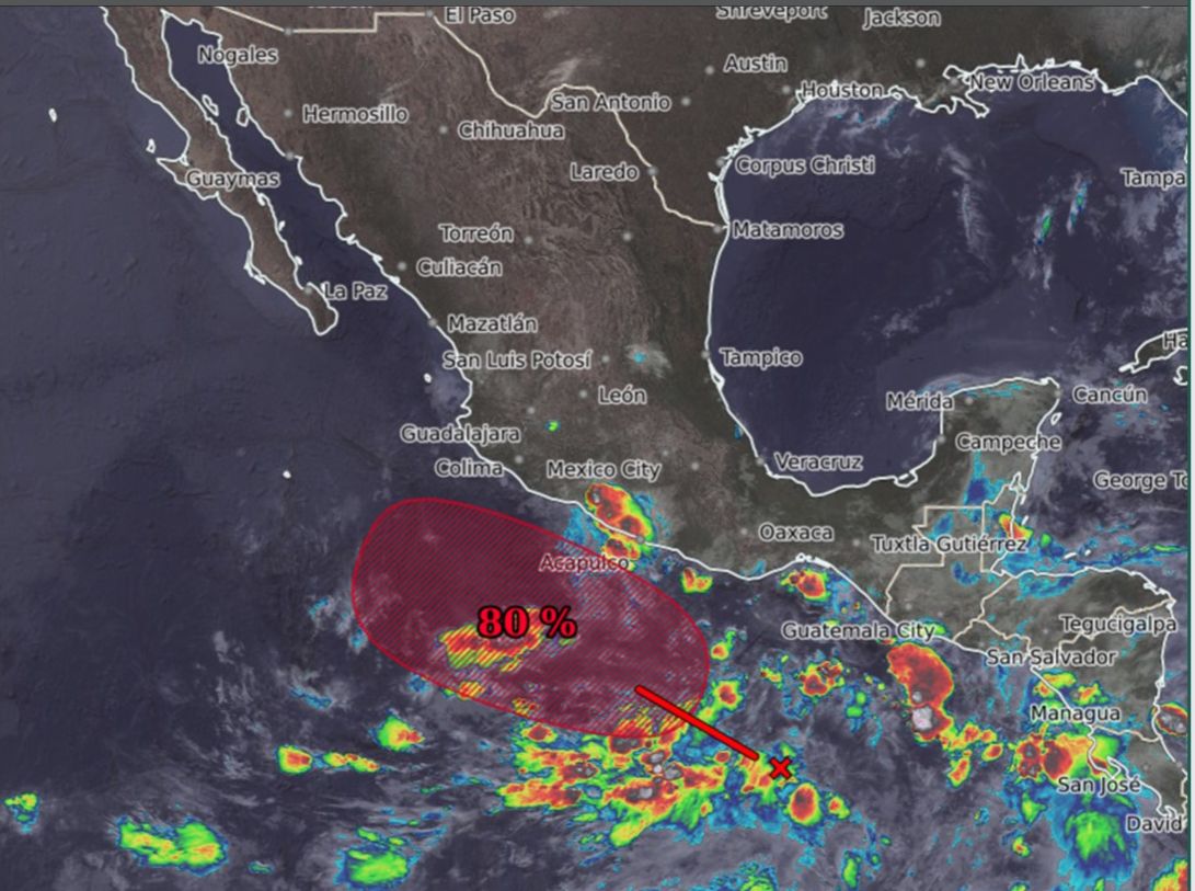 AVISO. ❗️| Continúa este martes la vigilancia sobre la posible formación de una zona de baja presión frente a costas de Oaxaca, Guerrero y Michoacán, la cual tiene ahora un…