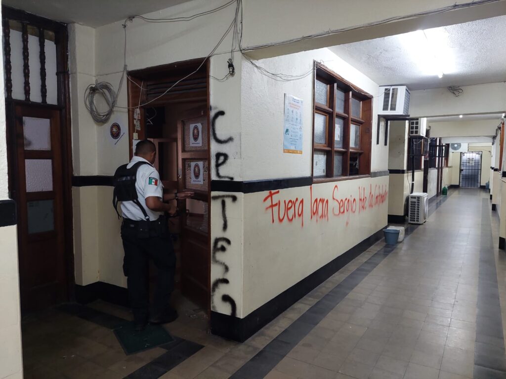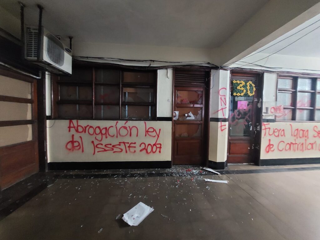Integrantes de la Coordinadora Estatal de Trabajadores de la Educación en Guerrero tomaron las oficinas de los Servicios Educativos en el edificio Oviedo en Acapulco, donde causaron destrozos y pintas, mientras que en Finanzas de la Quebrada y Garita solo desalojaron al personal.