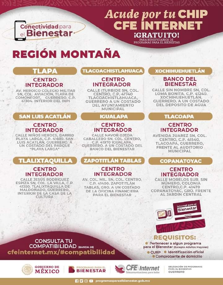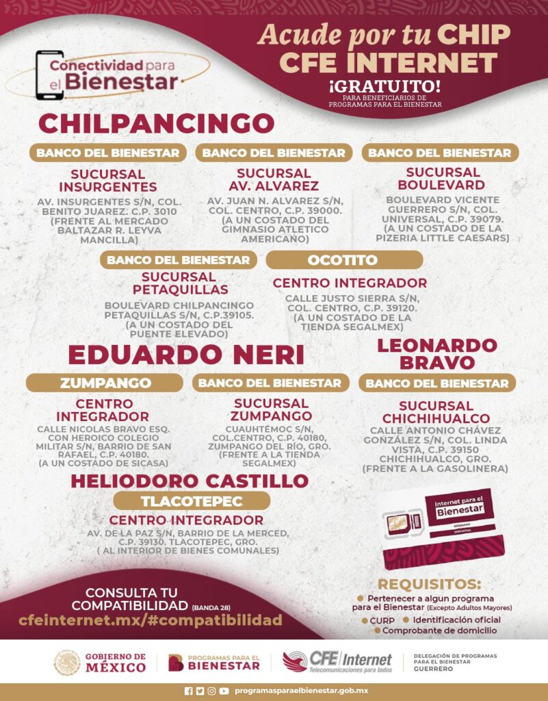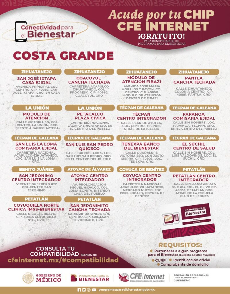 CFE ofrece internet gratuito para beneficiarios de programas del bienestar en Guerrero (excepto programa de adultos mayores). Navegación de entradas Monitorean las presas de Guerrero ante las últimas lluvias Ocupación hotelera en este lunes 05 de agosto