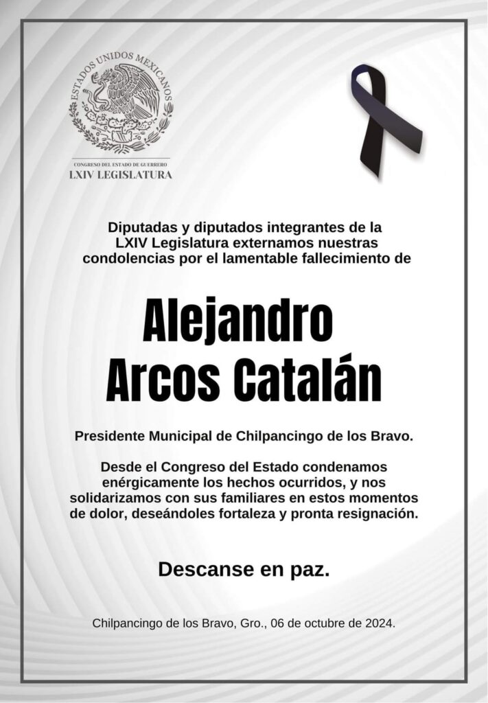 Las diputadas y los diputados que integramos la LXIV legislatura al Congreso del Estado de Guerrero condenamos enérgicamente el homicidio del presidente municipal de Chilpancingo Alejandro Arcos Catalán y manifestamos nuestras condolencias a sus familiares, amigos, amigas, compañeras y compañeros.