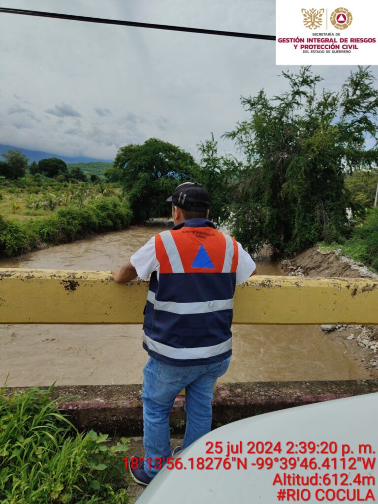 Chilpancingo, Gro., 25 de julio de 2024.- Personal operativo de la Secretaría de Gestión Integral de Riesgos y Protección Civil en las regiones Norte, Tierra Caliente y Centro, se mantienen en alerta preventiva y activaron los protocolos de monitoreo al nivel del cauce del Río Balsas, el cual ha presentado un incremento en su caudal, derivado de las últimas lluvias que se han registrado en los vecinos estados de Morelos y Puebla.