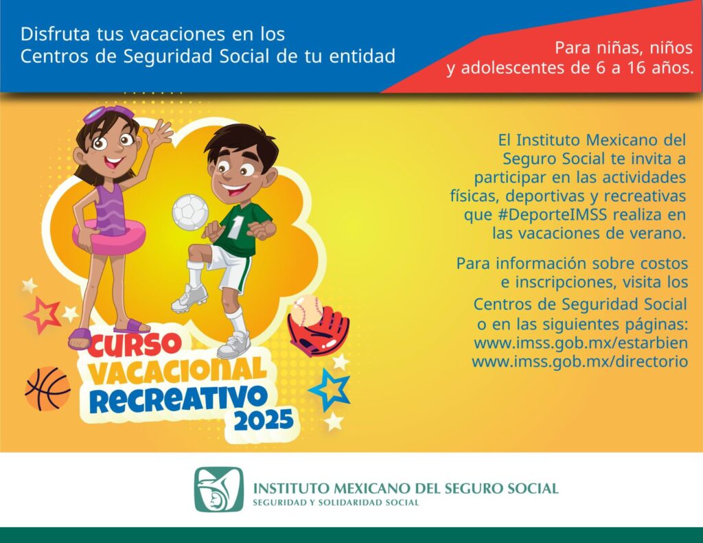 El Instituto Mexicano del Seguro Social (IMSS) en Guerrero invita a niñas, niños y jóvenes a participar en el Curso Vacacional Recreativo 2025, que se realizará del 21 de julio al 15 de agosto en los Centros de Seguridad Social (CSS) en Acapulco, Taxco, Iguala y Chilpancingo.