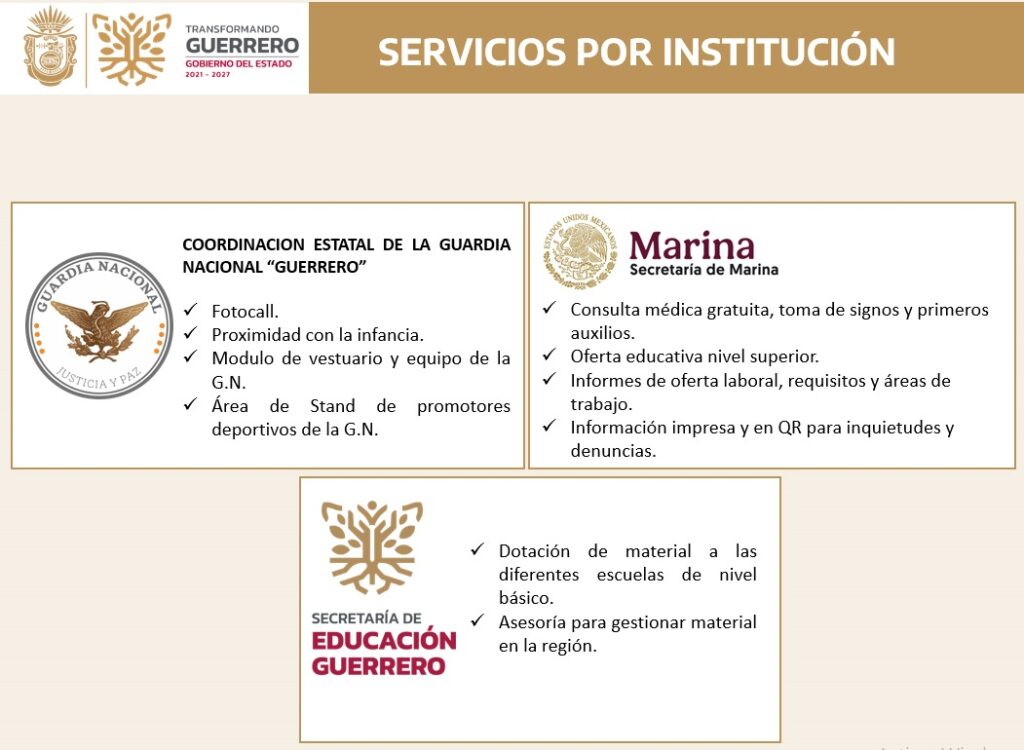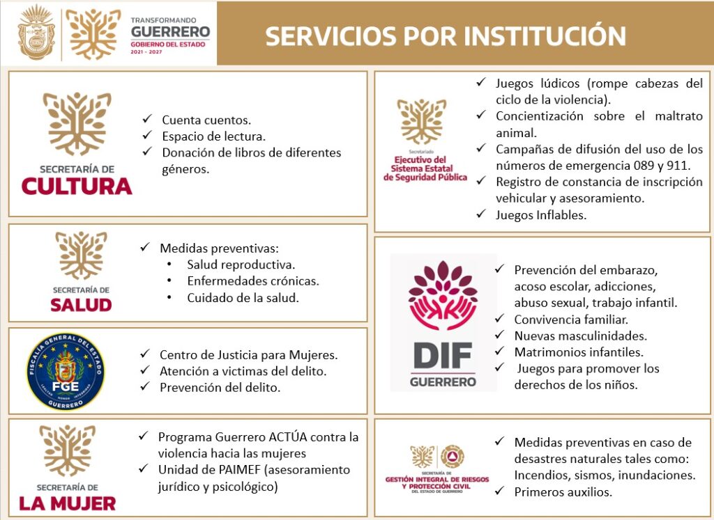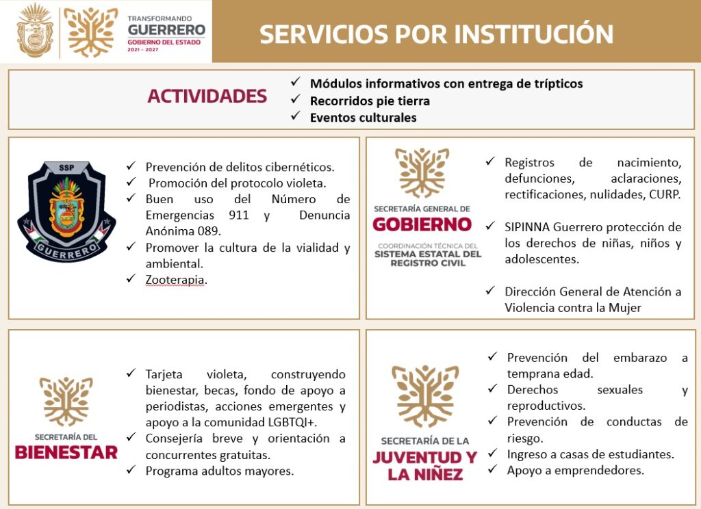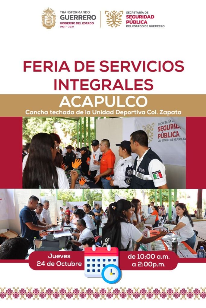 El Gobierno del Estado de Guerrero te invita a asistir a la Feria de los Servicios Integrales, un espacio diseñado para acercar a la ciudadanía los diversos servicios que ofrece la administración pública estatal. Podrás realizar trámites importantes como el registro de nacimiento, aclaraciones y rectificaciones de actas, bodas civiles, solicitud de CURP, tramitación de la Tarjeta Violeta, acceso a becas, y recibir atención médica, ¡todo de manera gratuita!