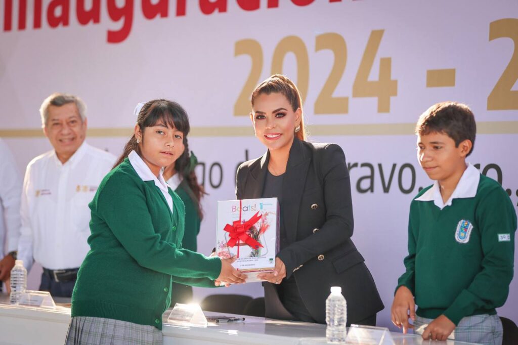 Durante el evento, la gobernadora entregó libros de texto gratuitos en la Secundaria «Raymundo Abarca Alarcón», donde además dotó a la institución de material didáctico, herramientas, de limpieza y papelería, así como deportivo y equipo de banda de guerra, microscopios para los talleres y pintarrones.