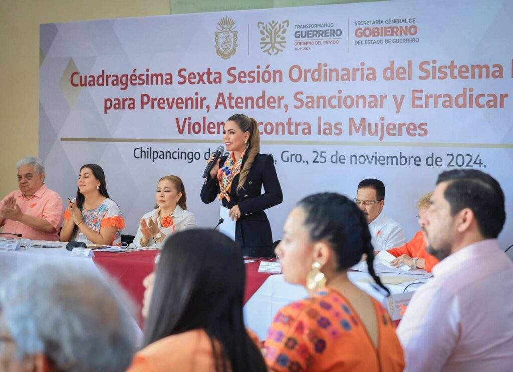 Chilpancingo, Gro., 25 de noviembre del 2024. – Con el llamado a combatir toda forma de violencia contra las mujeres, la gobernadora Evelyn Salgado Pineda presidió la 46ª Sesión del Sistema Estatal para Prevenir, Atender, Sancionar y Erradicar la Violencia contra la Mujer, donde reafirmó su compromiso de seguir implementado acciones integrales que impulsen su desarrollo, garantizando en Guerrero una vida libre con bienestar.