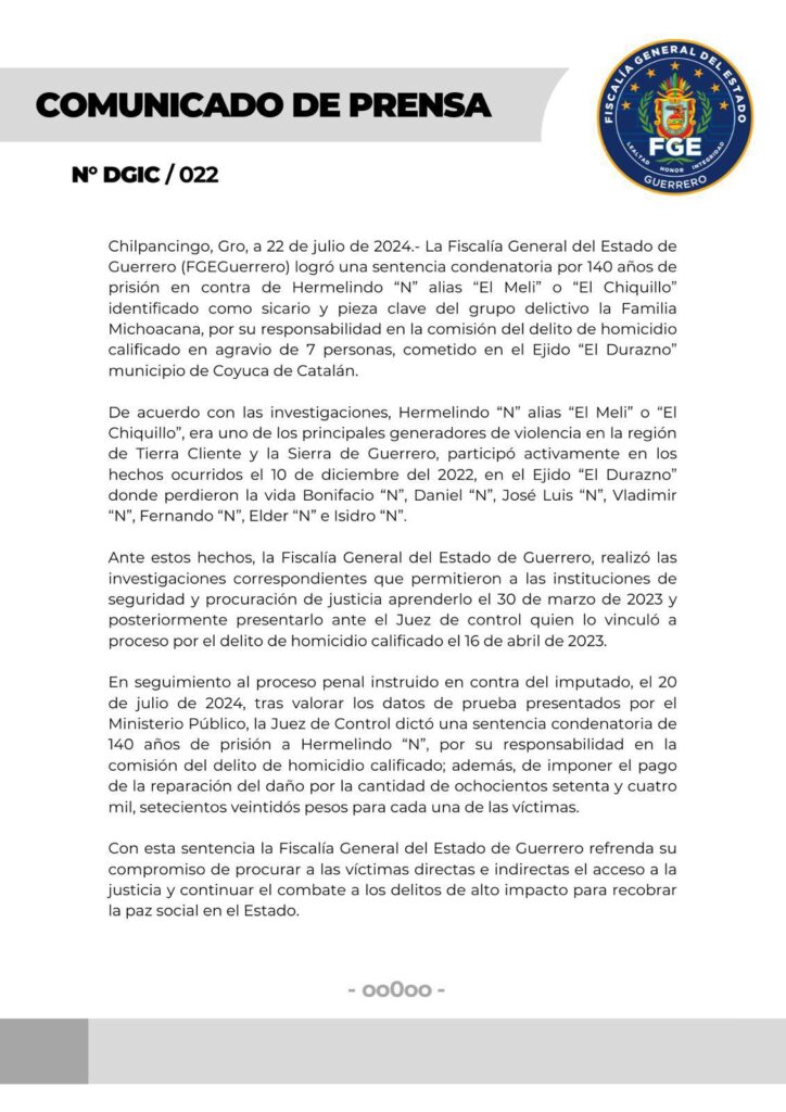 Chilpancingo, Gro, a 22 de julio de 2024.- La Fiscalía General del Estado de Guerrero (FGEGuerrero) logró una sentencia condenatoria por 140 años de prisión en contra de Hermelindo “N” alias “El Meli” o “El Chiquillo” identificado como sicario y pieza clave del grupo delictivo la Familia Michoacana, por su responsabilidad en la comisión del delito de homicidio calificado en agravio de 7 personas, cometido en el Ejido “El Durazno” municipio de Coyuca de Catalán.
