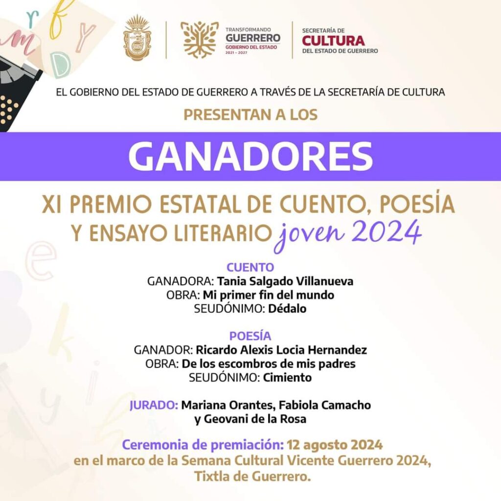 Acapulco, Gro., a 10 de agosto de 2024.- Después de un dictamen realizado este miércoles 7 de agosto de manera virtual y de acuerdo a la convocatoria, el Gobierno de Guerrero que encabeza Evelyn Cecia Salgado Pineda, a través de la Secretaría de Cultura a cargo de Aída Melina Martínez Rebolledo, se dieron a conocer los resultados del XI Premio Estatal de Cuento, Poesía y Ensayo Literario Joven “Juventud que transforma” 2024.