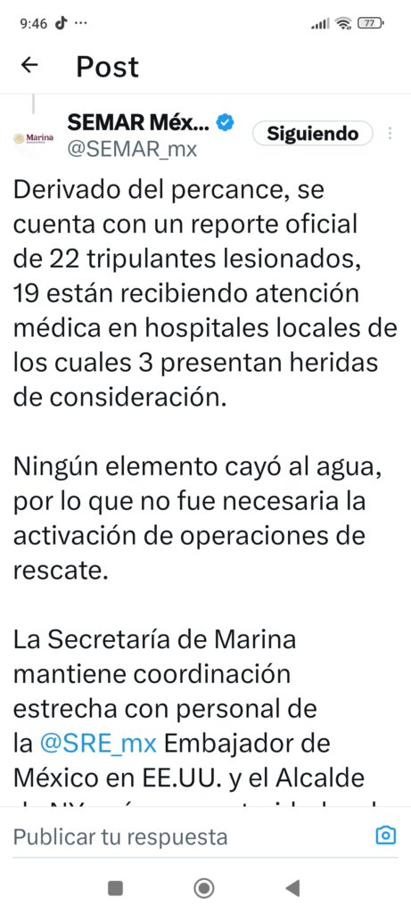 La Secretaría de Marina mantiene coordinación estrecha con personal de la @SRE_mx Embajador de México en EE.UU. y el Alcalde de NY, así como autoridades de esa Ciudad, están brindando atención oportuna al personal y asegurando el bienestar de la tripulación.