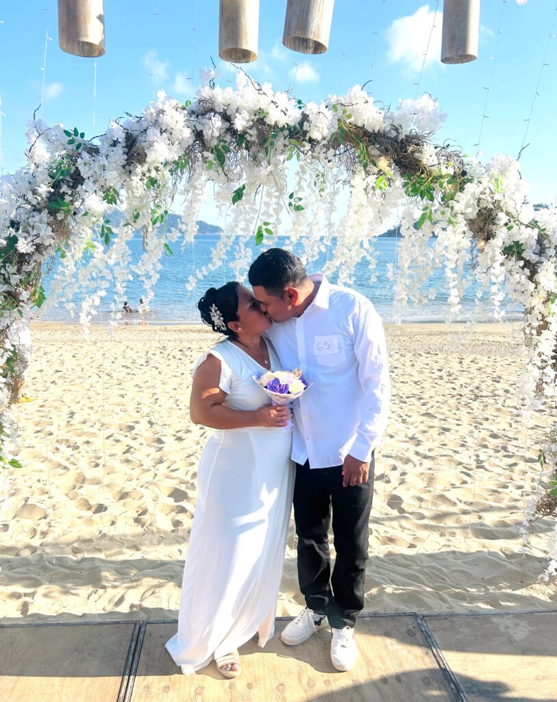 En la franja de arena de la playa Tamarindos, los recién casados realizaron la entrega de anillos, realizaron el brindis, así como la partida de pastel, bailaron el vals a cargo de la Banda de música del Ayuntamiento, disfrutaron de unos bocadillos y los grupos musicales La Luz Roja de San Marcos y Súper Máquina Musical del Guerrero.