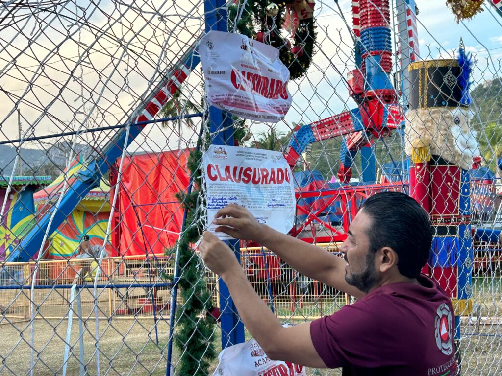 Acapulco, Gro., 24 de diciembre de 2024.- Por indicaciones de la Presidenta Municipal, Abelina López Rodríguez, la Coordinación General de Protección Civil y Bomberos, así como de la Dirección de Reglamentos y Espectáculos realizaron la clausura definitiva de la “Feria Acapulco 2024” instalada al interior del Club de Deportivo, esto tras la caída del juego mecánico “Mini Teleférico”.