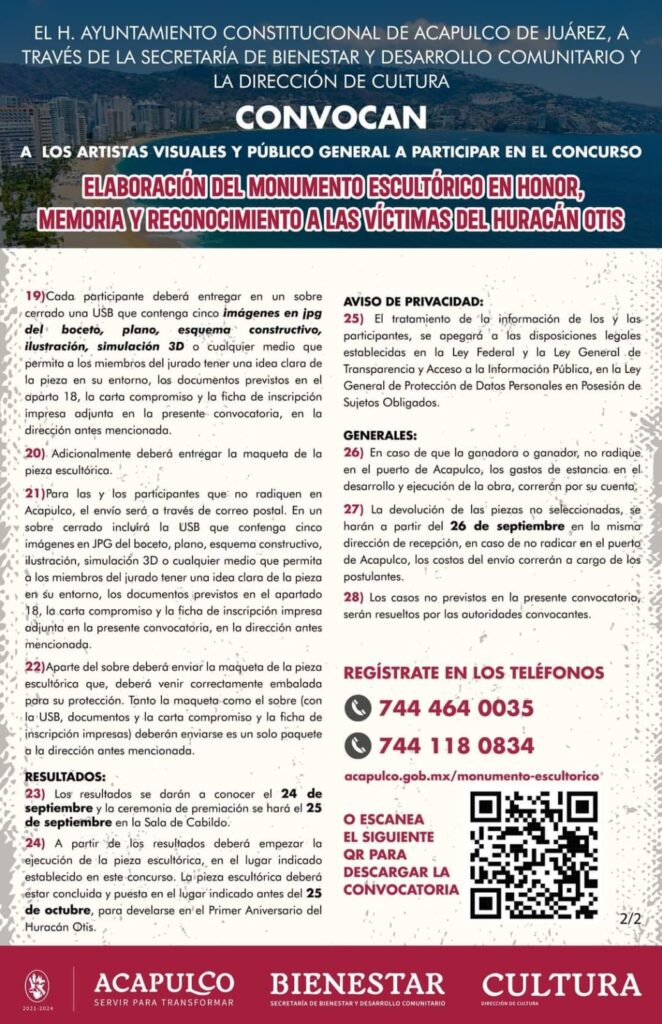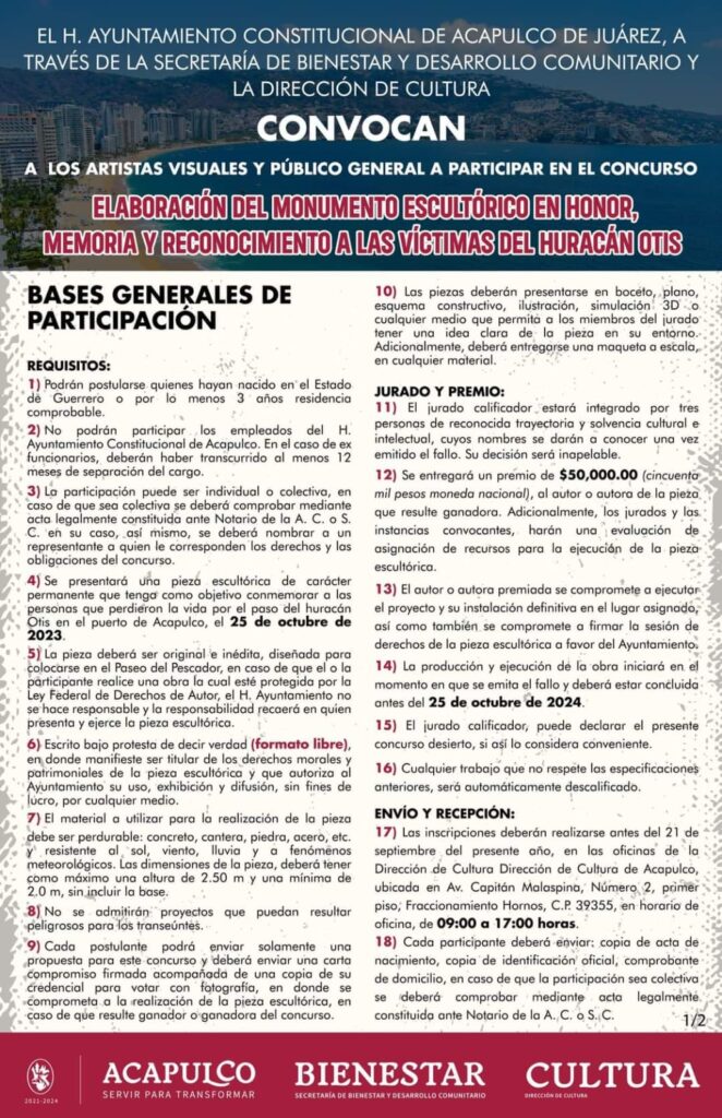 La administración municipal de Acapulco a través de la Secretaría de Bienestar y Desarrollo Comunitario, abre la convocatoria para el concurso: Elaboración del Monumento Escultórico en Honor, Memoria y Reconocimiento a las víctimas del Huracán Otis.