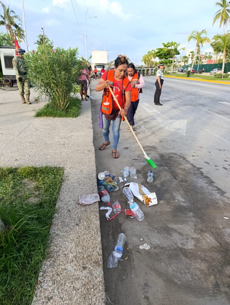 Personal de esta dependencia del sector Artesanías, llevó a cabo labores de barrido manual en la Costera Miguel Alemán a la altura del Asta Bandera, antes, durante y después, del evento.