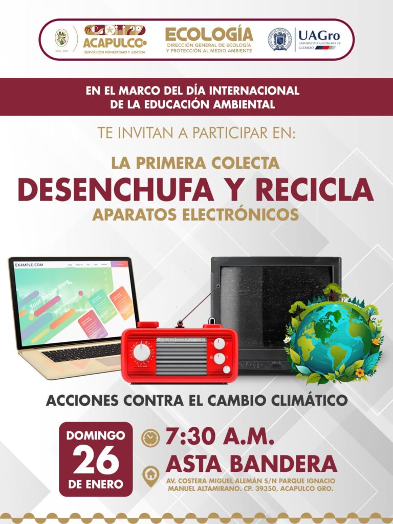 Acapulco, Gro., 23 de enero de 2025.- Con el objetivo de crear conciencia y combatir los efectos del cambio climático, el Gobierno Municipal que encabeza la Presidenta, Abelina López Rodríguez invita a la sociedad a participar en la primera colecta “Desenchufa y Recicla Aparatos Electrónicos”.