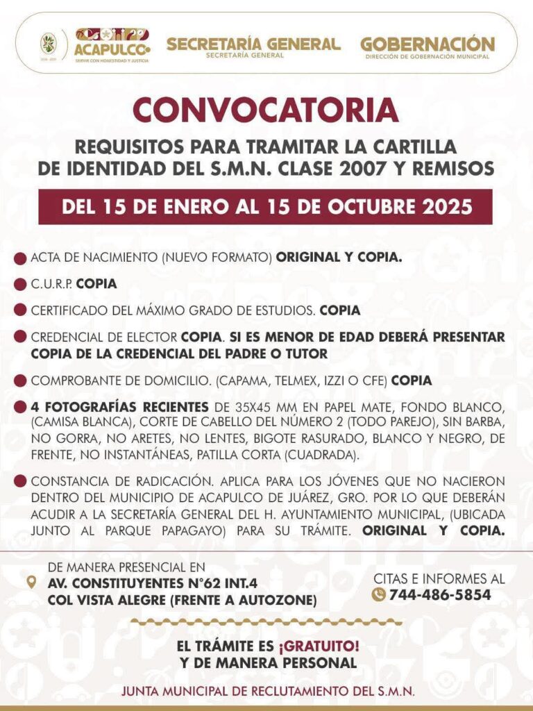 Acapulco, Gro., 21 de septiembre de 2025.- La Dirección de Gobernación del Ayuntamiento de Acapulco invita a los jóvenes de la clase 2007 y remisos a iniciar el trámite de la Cartilla de Identidad del Servicio Militar Nacional (SMN), un documento indispensable para cumplir con las obligaciones cívicas establecidas por la ley.