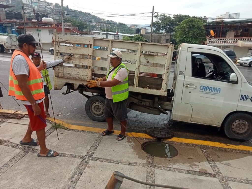 Acapulco, Gro a 02 de octubre de 2024. El Gobierno de la Presidenta Abelina López Rodríguez a través de la Comisión de Agua Potable y Alcantarillado del Municipio de Acapulco (CAPAMA), mantiene de manera permanente la brigada emergente de desazolve de pozos de visita y limpieza de registros.El director general de CAPAMA, Hugo Lozano Hernández, indicó que personal del área de Alcantarillado coadyuva en la limpieza y liberación de vialidades, así como desazolve de pozos de visita.Lozano Hernández, precisó que los principales puntos en donde se realizan estas acciones es la avenida Costera Miguel Alemán, así como en la zona urbana, conurbada y Poniente, además se coadyuva en el levantamiento de arena que dejó el arrastre del paso del huracán John.El funcionario municipal, reiteró que las diferentes áreas del organismo operador del agua, redoblan esfuerzos para evitar taponamientos y colapsos de tuberías y colectores en esta temporada de lluvias, a su vez recordó a los usuarios que se atienden los reportes a través de las redes oficiales de la CAPAMA y del call center 073.