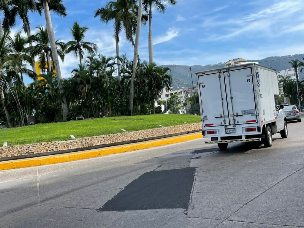 Cuadrillas bachean con concreto asfáltico, tramos de la Costera Miguel Alemán como la glorieta de la Base Naval y a la altura del Centro Internacional Acapulco (CIA).