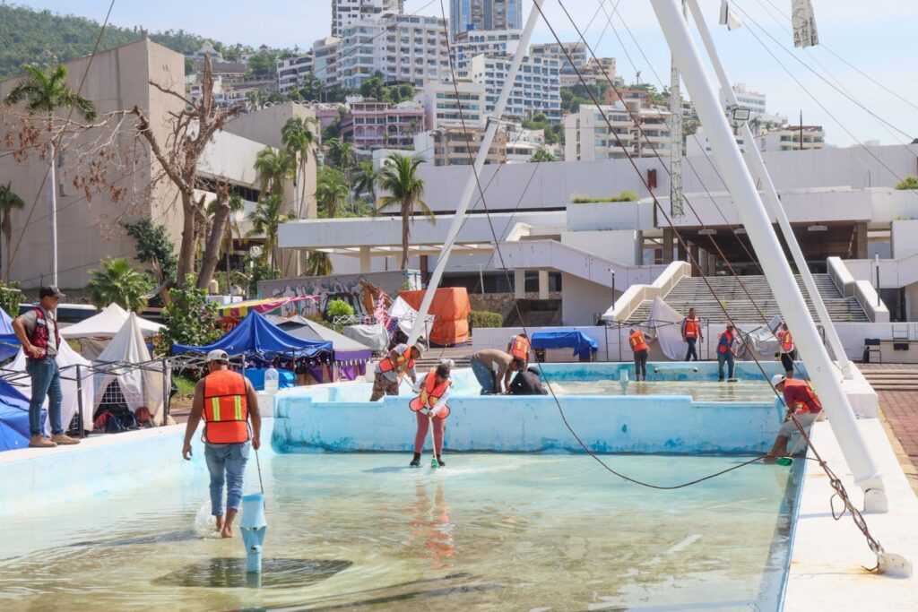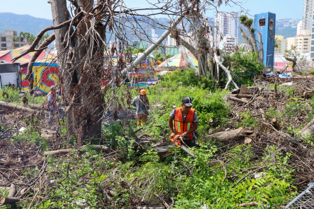 Detalló que alrededor de 50 personas colaboran en la tala de árboles caídos por el huracán Otis, así como en el retiro de agua estancada en las fuentes, barrido y desinfección en los accesos.