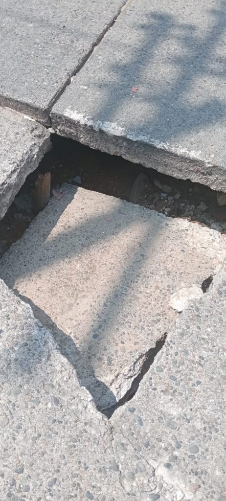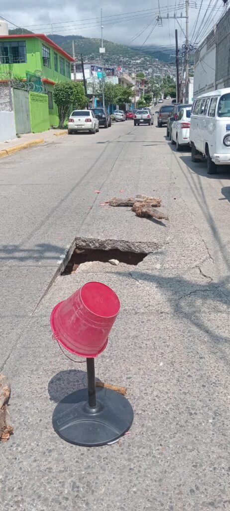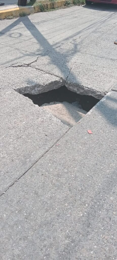 Reportan un socavón que se está formando en la calle Almendros en la col. Carabalí, en el centro de Acapulco, a un lado de Panamericana de protección de valores, en calle Diego Hurtado de Mendoza.