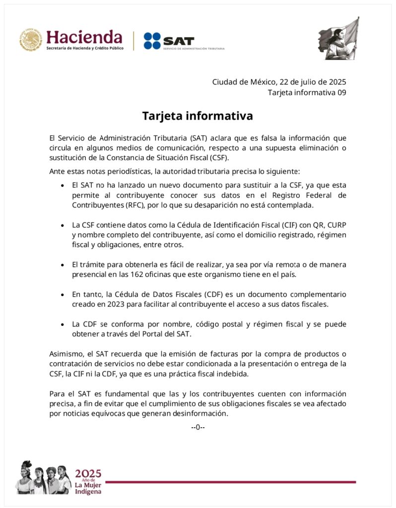 El Servicio de Administración Tributaria (SAT) aclara que es falsa la información que circula en algunos medios de comunicación, respecto a una supuesta eliminación o sustitución de la Constancia de Situación Fiscal (CSF).