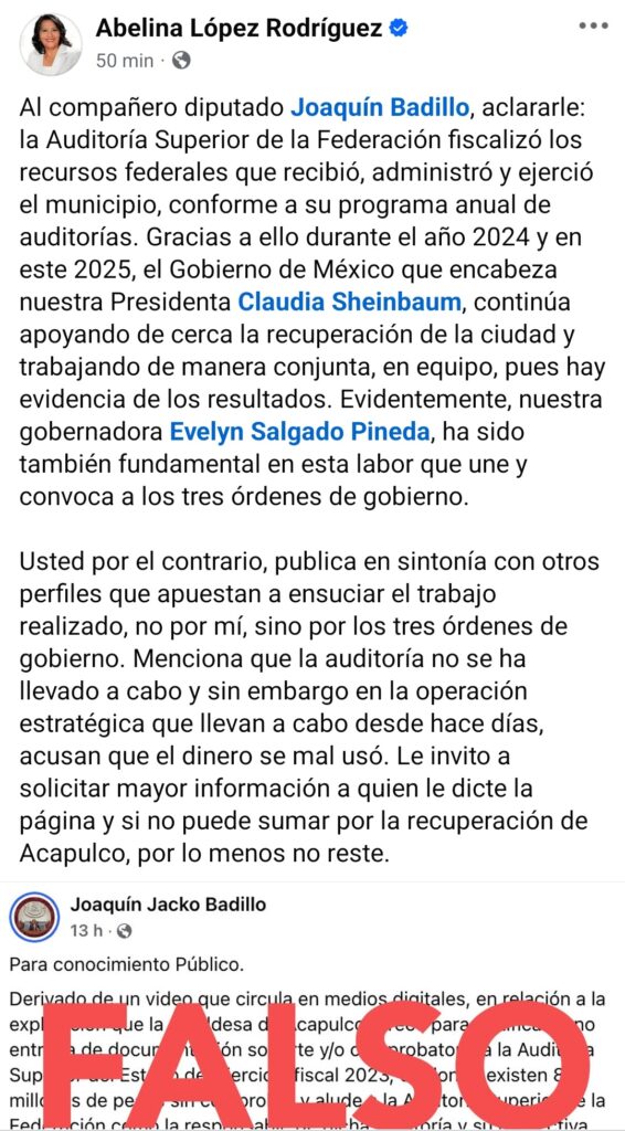 Evidentemente, nuestra gobernadora Evelyn Salgado Pineda, ha sido también fundamental en esta labor que une y convoca a los tres órdenes de gobierno. Usted por el contrario, publica en sintonía con otros perfiles que apuestan a ensuciar el trabajo realizado, no por mí, sino por los tres órdenes de gobierno. Menciona que la auditoría no se ha llevado a cabo y sin embargo en la operación estratégica que llevan a cabo desde hace días, acusan que el dinero se mal usó. Le invito a solicitar mayor información a quien le dicte la página y si no puede sumar por la recuperación de Acapulco, por lo menos no reste.