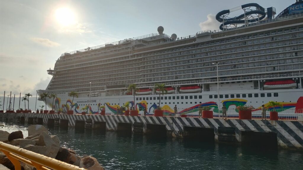 Acapulco, Gro., 28 de octubre de 2025.- La mañana de este martes autoridades, prestadores de servicios turísticos y residentes dieron la bienvenida al puerto de Acapulco al segundo crucero de la temporada, Norwegian Encore con bandera de Bahamas, transportando a 3,730 pasajeros y 1,616 tripulantes.