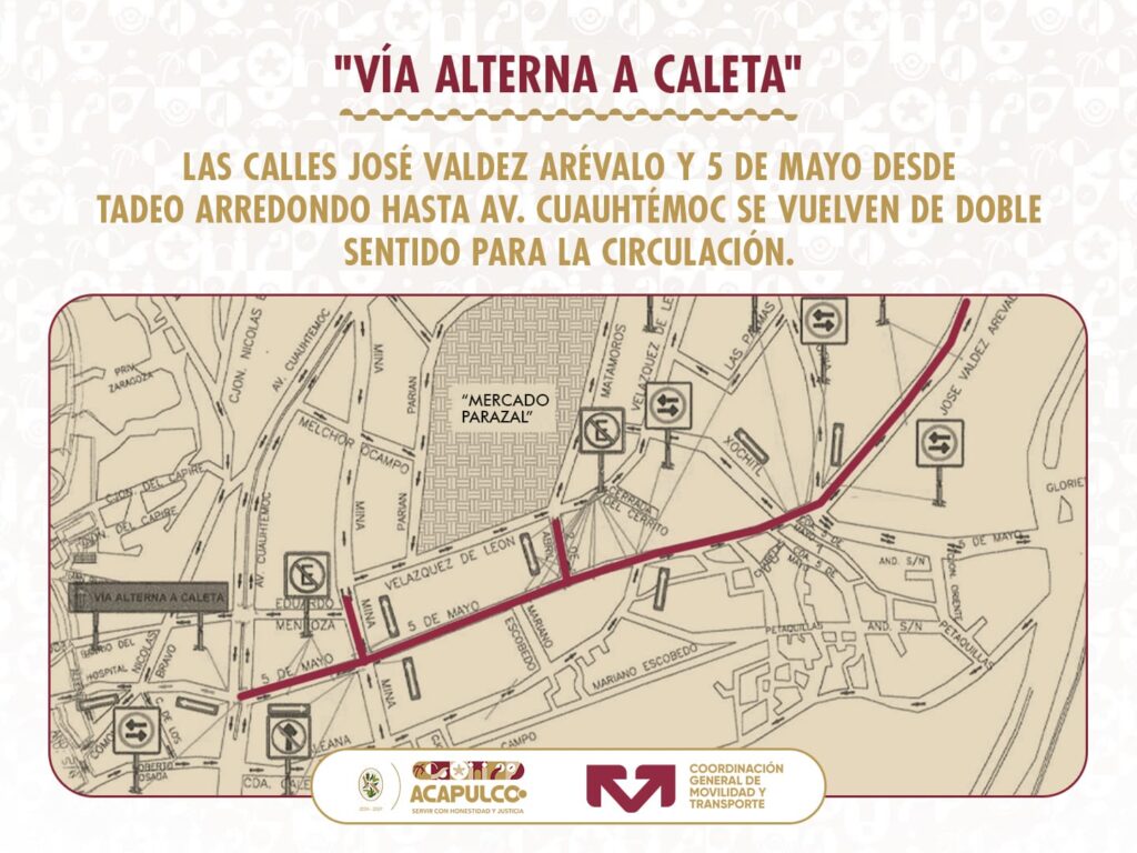 Acapulco, Gro., 01 de abril de 2025.- El Gobierno Municipal que encabeza la Presidenta Abelina López Rodríguez informa a la ciudadanía que como parte del proyecto “Vía Alterna a Caleta”, calles del centro de la ciudad se han establecido en doble sentido.