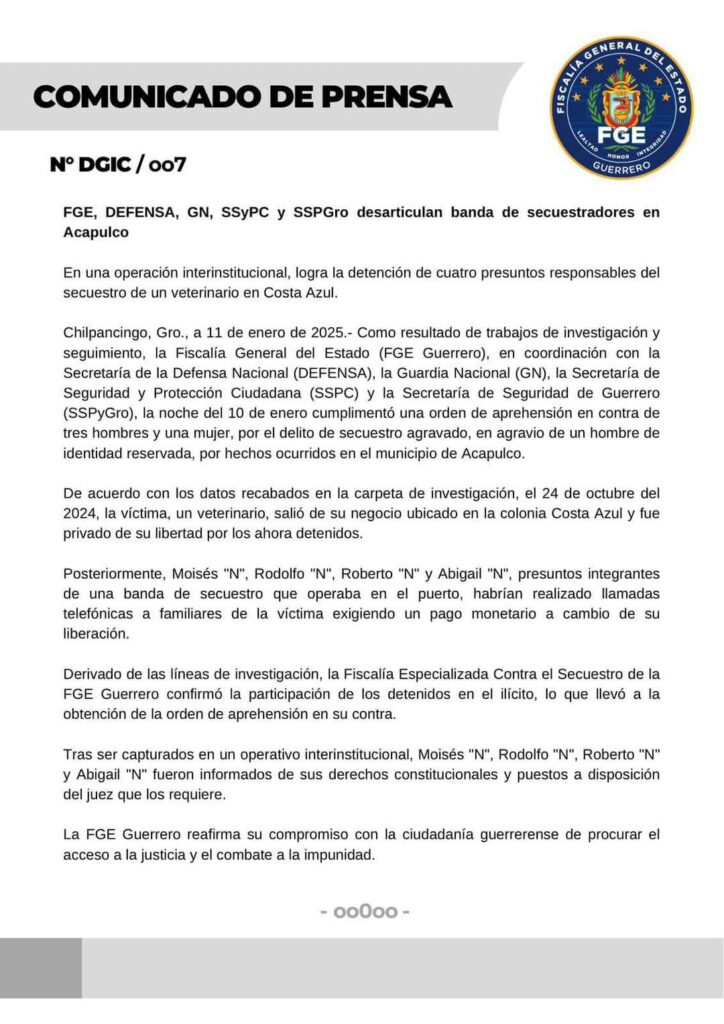 *FGE, DEFENSA, GN, SSyPC y SSPGro logran la detención de cuatro presuntos responsables