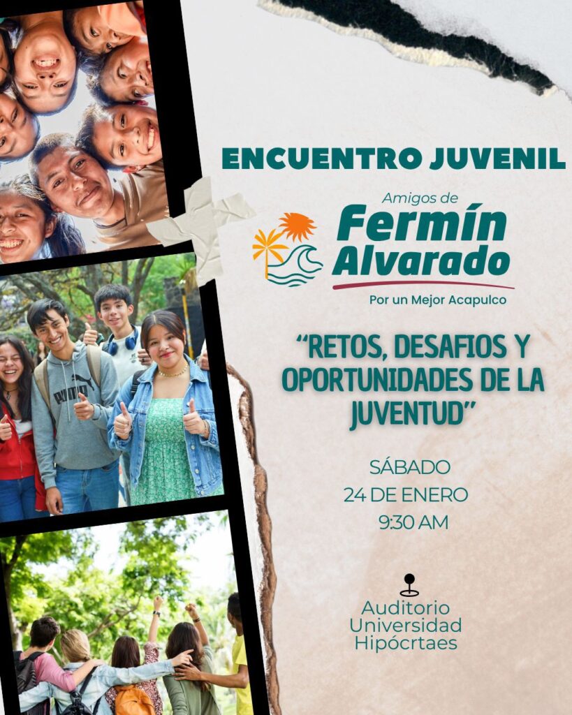 El maestro Fermín Gerardo Alvarado Arroyo, Presidente de la Asociación “Amigos de Fermín Alvarado, por un Mejor Acapulco”, convocó e invitó a las y los jóvenes de Acapulco a participar en el Encuentro de la Estructura Juvenil de la Asociación, así como en el Foro de Juventud y Liderazgo titulado “Retos, Desafíos y Oportunidades para la Juventud”, que se llevará a cabo el sábado 24 de enero de 2026, a las 9:30 de la mañana, en el Auditorio de la Universidad Hipócrates de Acapulco.
