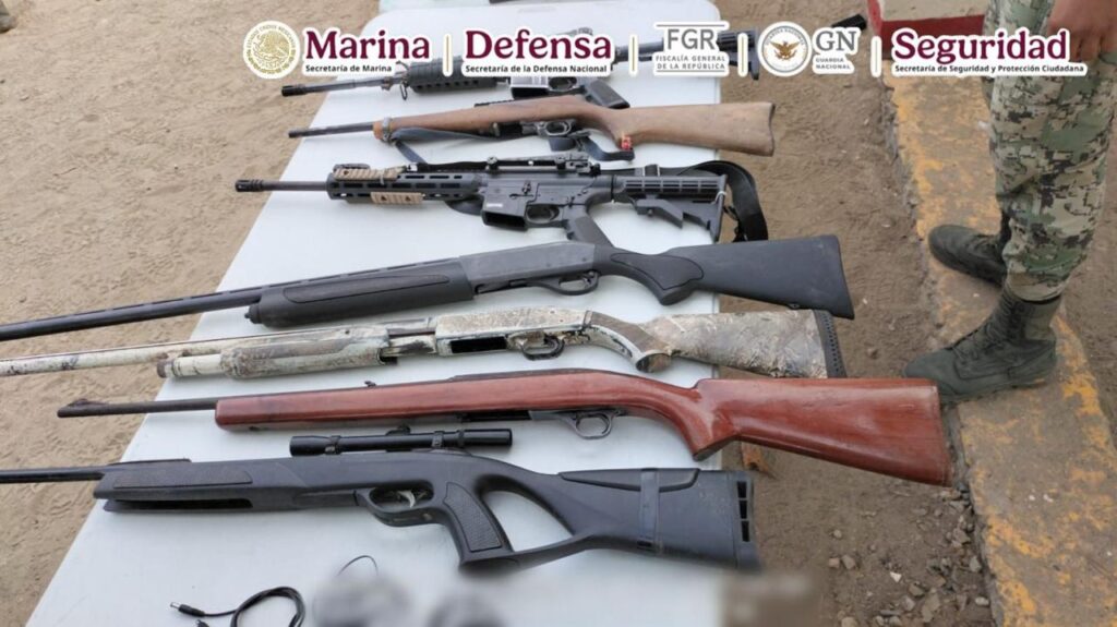 Posteriormente, se ubicó y desmanteló un campamento clandestino donde se encontraron vehículos, así como armamento, municiones, ropa, calzado táctico y material diverso.