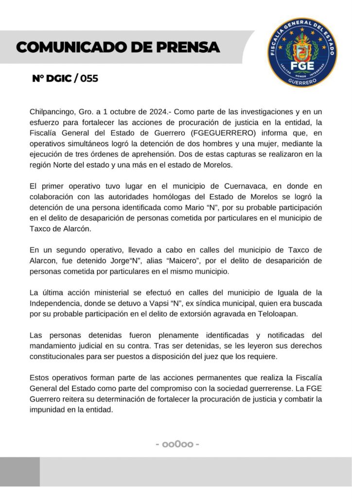 Chilpancingo, Gro. a 1 octubre de 2024.- Como parte de las investigaciones y en un esfuerzo para fortalecer las acciones de procuración de justicia en la entidad, la Fiscalía General del Estado de Guerrero (FGEGUERRERO) informa que, en operativos simultáneos logró la detención de dos hombres y una mujer, mediante la ejecución de tres órdenes de aprehensión. Dos de estas capturas se realizaron en la región Norte del estado y una más en el estado de Morelos.