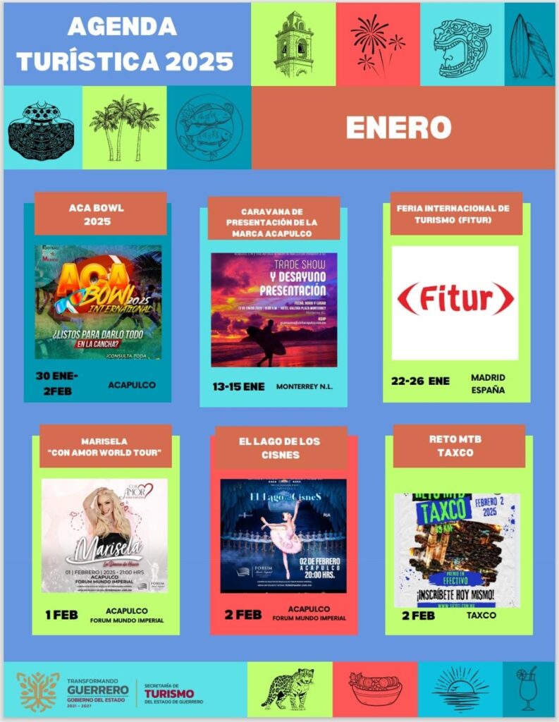Acapulco, Gro., 10 de enero de 2025.- Guerrero tendrá este año una gran cartelera de eventos artísticos, deportivos y culturales, como parte de las acciones implementadas para fortalecer la agenda turística por el gobierno del estado que encabeza Evelyn Salgado Pineda.