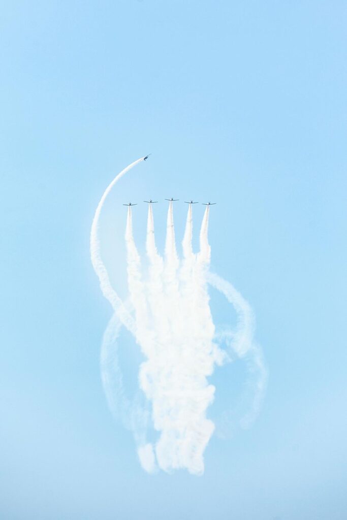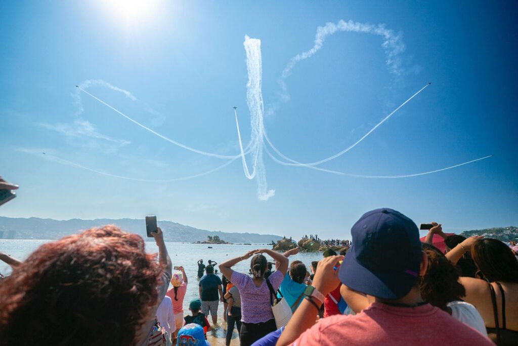 El espectáculo aéreo, a cargo de la Fuerza Aérea Mexicana, contó con más de 10 aeronaves, destacando la presencia de las Águilas Aztecas, que con sus maniobras captaron la atención de residentes y turistas.
