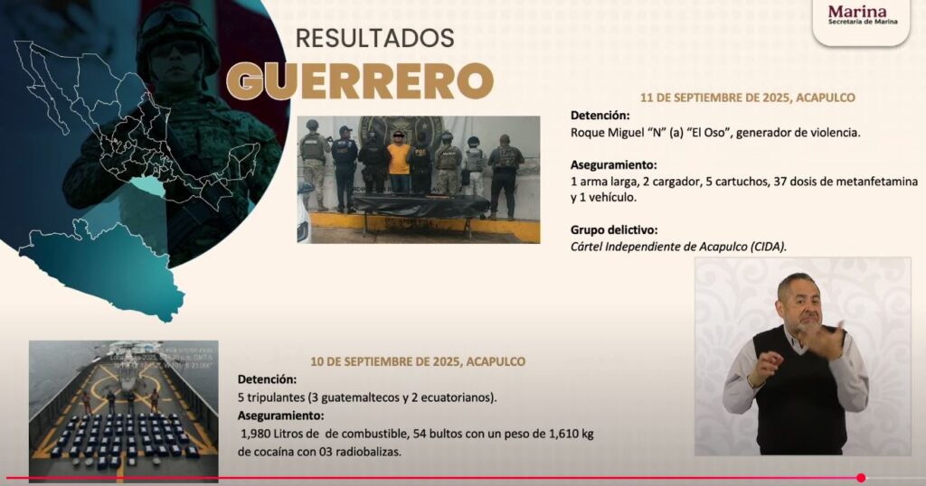 En uno de ellos, fue detenido Roque Miguel “N”, alias “El Oso”, presunto generador de violencia e integrante de un grupo criminal que opera en la zona, a quien se le aseguraron armas de fuego, metanfetaminas y vehículos, mientras que en otro operativo, elementos de la Secretaría de Marina interceptaron una embarcación con cinco tripulantes, asegurando 1,610 kilogramos de cocaína, cifra que se suma a las más de 48 toneladas de droga aseguradas en altamar por la Armada de México en lo que va del año.