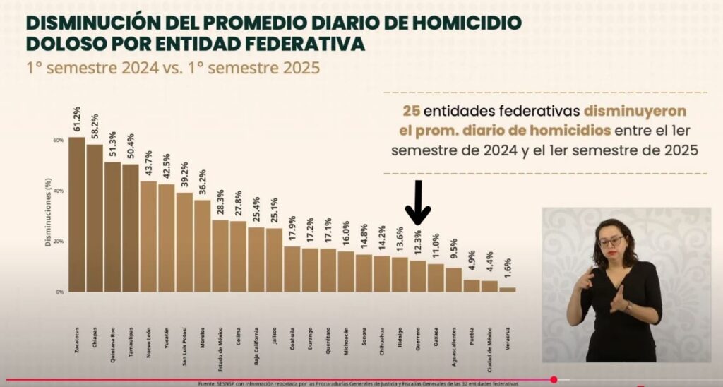 Durante la conferencia matutina encabezada por la presidenta Claudia Sheinbaum Pardo, se dio a conocer que Guerrero se encuentra entre las 25 entidades del país que lograron reducir la incidencia de homicidios dolosos durante el primer semestre de este año, en comparación con el mismo periodo de 2024.