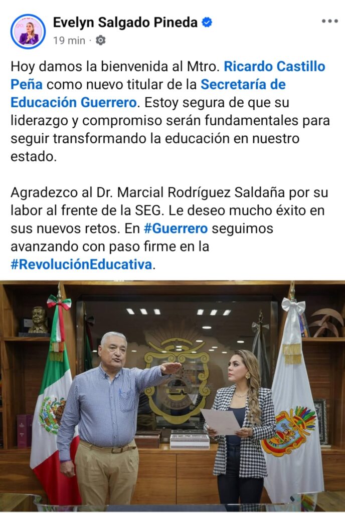 Chilpancingo, Gro., 30 de enero de 2025.– La gobernadora Evelyn Salgado Pineda designó al Mtro. Ricardo Castillo Peña como nuevo titular de la Secretaría de Educación Guerrero (SEG), destacando su liderazgo y compromiso con la transformación educativa en el estado.