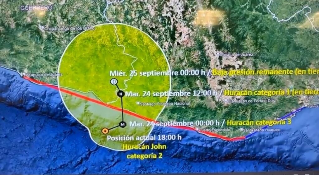 Continúa en categoría 2 el huracán Jhon, podría tocar tierra entre las 12 de la noche y 1 de la mañana afectando a los municipios de Cuajinicuilapa, Marquelia, Copala y Cruz Grande, informan la coordinadora nacional de Protección civil Laura Velázquez Alzúa y la gobernadora de Guerrero Evelyn Salgado Pineda.